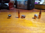 A la Derecha, 180gn Hornady Interloock (muy común en todas las armerias) 39gn de A27. En mi opinión, la 3xpangión es bastante chota, despareja.