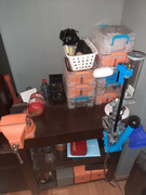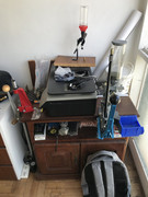 Yo tenía en el escritorio un lugar muerto en un ángulo y, aprovechando que mi mujer no lo había ocupado todavía (no la dejé pensar), mandé a hacer rápido una mesita de 70x40 cm en madera de pino. Le pegué unas manos de pintura y así pude tener instalada la prensa!!! Como se puede ver en la foto, también pude poner la morsa que siempre quise tener. Es más, entre la prensa y la morsa voy a poner una segunda prensa que ya tengo, una monoestación Lyman Ideal (de hecho en la foto aparece escondida abajo a la izquierda en su caja todavía), la cual voy a poner/sacar según necesidad, para hacer algunas cosas que con Dillon Square Deal B no puedo: